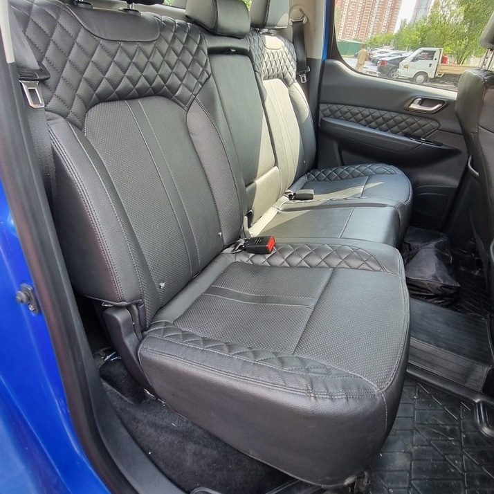 Внутри пикапа не ожидаешь увидеть мягкий пластик и приятную на ощупь отделку. Да еще и удобные кресла. Это сразу навивает мысли о длительном путешествии на море всей семьей. Машина 5-местная. Расположится без проблем можно даже задним пассажирам. Водительское кресло имеет электрорегулировки, в том числе и регулировку по высоте. Весь функционал на физических кнопках. Причем практически все продублировано еще и кнопками на руле. Есть небольшой сенсорный монитор, но тянутся к нему не очень удобно, поэтому я все переключал именно с кнопок, под правой рукой.